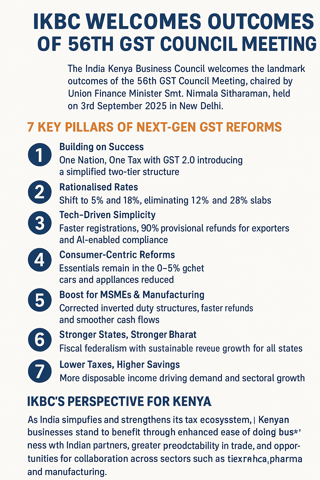 The India Kenya Business Council (IKBC) welcomes the landmark outcomes of the 56th GST Council Meeting, chaired by Union Finance Minister Smt. Nirmala Sitharaman, held on 3rd September 2025 in New Delhi.